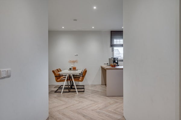 Via de entree bereikt u het netjes betegelde toilet met fonteintje. De sfeervolle zitkamer vormt samen met de moderne open keuken en aansluitende eetkamer een heerlijke leefruimte.