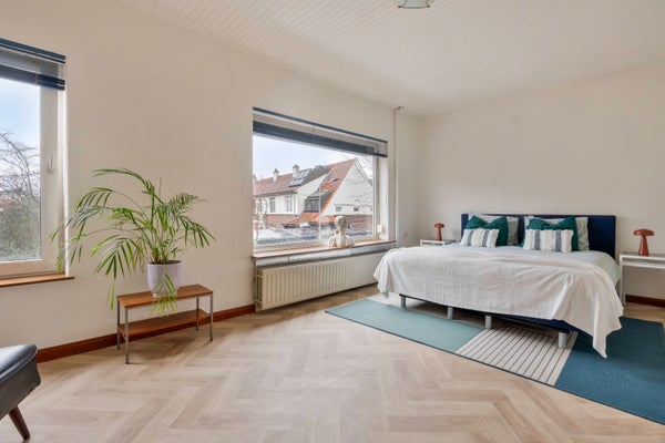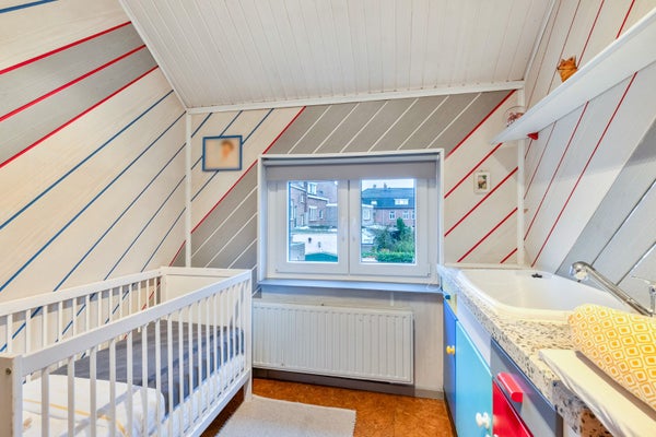 De overloop geeft toegang tot drie slaapkamers en de badkamer. Aan de voorzijde bevindt zich de royale master bedroom (ca. 21 m²) met bijzonder veel lichtinval en een praktisch rolluik. Aan de achterzijde ligt een unieke kamer, ideaal voor jonge gezinnen: deze is voorzien van een vast meubel met wastafel en een ingebouwd babybadje, compleet met warm water en afvoer. Ook de derde slaapkamer is ruim van opzet. Alle kamers beschikken over onderhoudsvriendelijke kunststof kozijnen met dubbele beglazing. De badkamer is volledig betegeld en praktisch ingericht met een douche, wastafel en een tweede (hangend) toilet.