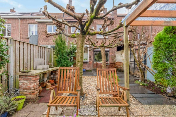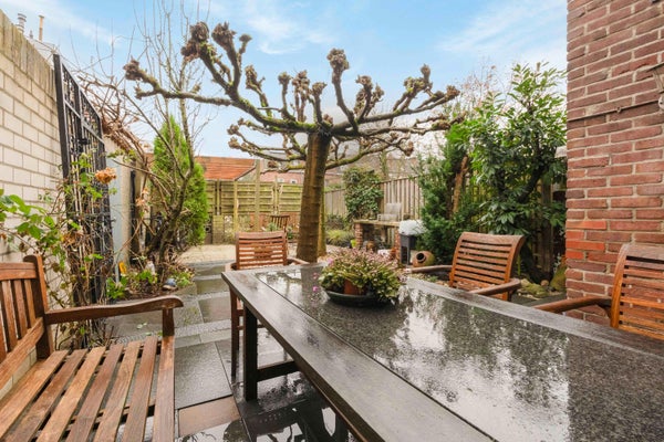 De sfeervolle stadstuin is gelegen op het zonnige zuiden en is voorzien van natuurstenen bestrating en een eigen achterom met overkapping voor de fietsen. De prachtige parasol moerbei bomen geven de tuin een groene uitstraling, bieden optimale privacy en zorgen in de zomer voor een heerlijk, natuurlijk schaduwdak.