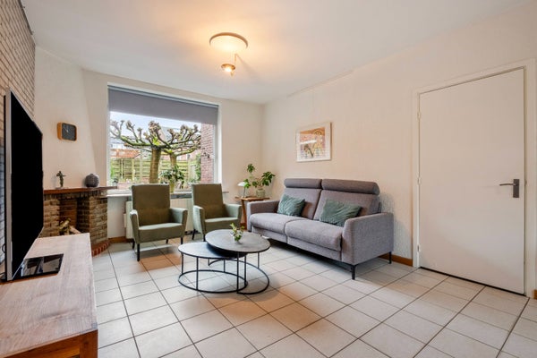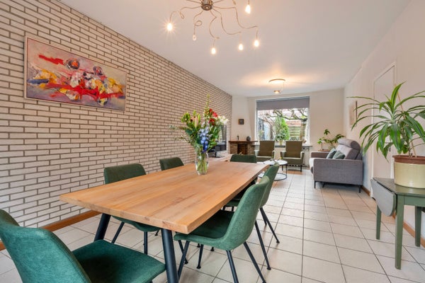 Via de karakteristieke voordeur komt u in de hal, waar een sfeervolle toog direct in het oog springt. Vanuit hier heeft u toegang tot het separate toilet en de kelder. De doorzonwoonkamer is opvallend ruim en licht opgezet. De aanwezige open haard en de wand van schoonmetselwerk zorgen hier voor extra warmte en sfeer, terwijl de grote raampartijen een fijn zicht op de tuin bieden. Aan zowel de voor- als achterzijde zijn praktische rolluiken aanwezig.