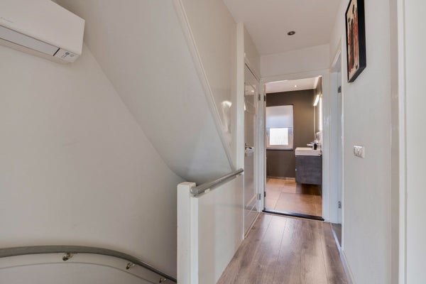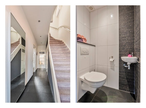 - Via de ruime hal met trapopgang betreed je de woning. Hier bevindt zich een separaat, volledig betegeld toilet.