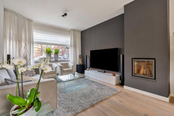 - De sfeervolle woonkamer (ca. 29m2) is een heerlijke leefruimte met een warme houthaard en een prachtige massief eikenhouten vloer, wat direct zorgt voor een luxe en huiselijke uitstraling.