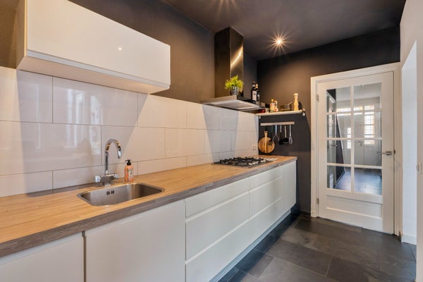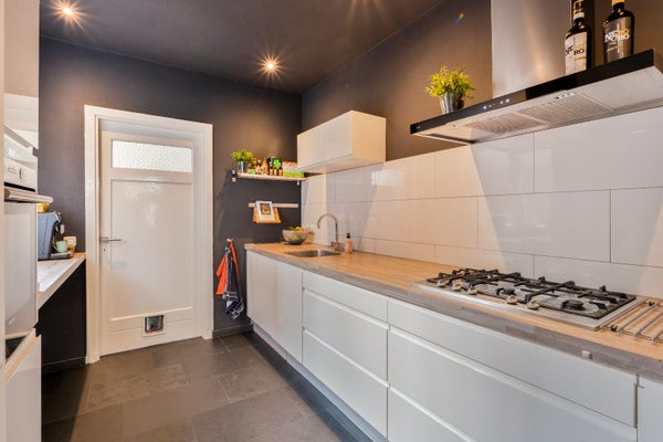 - De moderne keuken (ca. 9m2) is verdekt opgesteld en van alle gemakken voorzien, waaronder een oven, vaatwasser, 5-pits gasfornuis en koelkast. Aansluitend bevindt zich de bijkeuken (ca. 6,5m2) met witgoedaansluiting, bergkast en een deur naar de tuin.