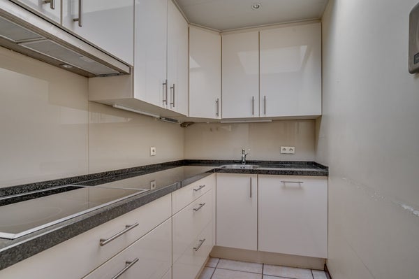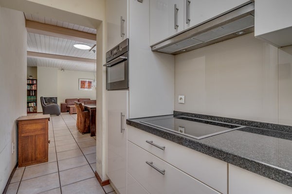 • Half open compacte keuken met nette inbouwcombinatie inclusief inbouwapparatuur: koelkast, inductie kookplaat, afzuigkap, combi magnetron en vaatwasmachine.