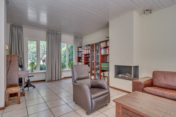 • Woonkamer met tegelvloer en gashaard aanwezig. Via 2 schuifpuien heeft toegang tot het royale terras. solartube aanwezig.
