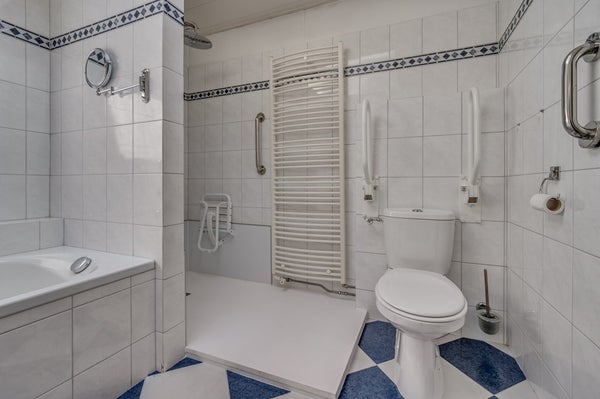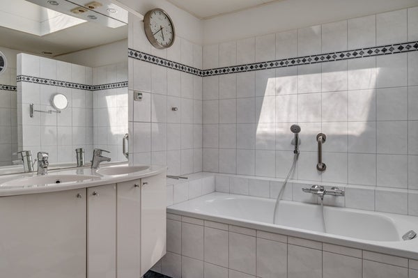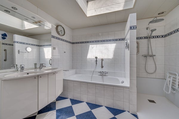 • Badkamer, wit betegeld met inloopdouche, ligbad, toilet en wastafelmeubel met dubbele wastafel; de badkamer is voorzien van een lichtkoepel.