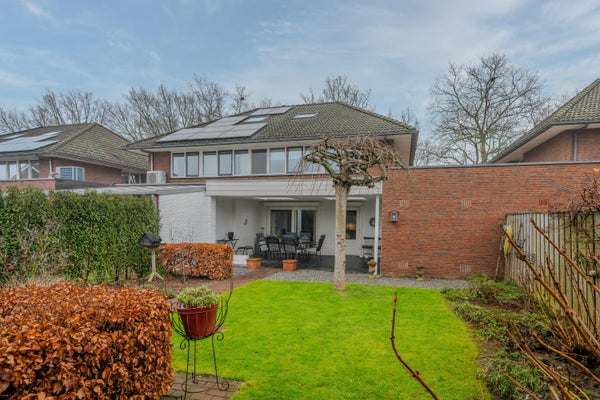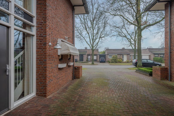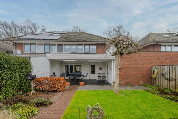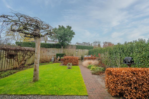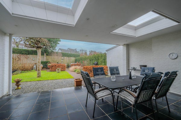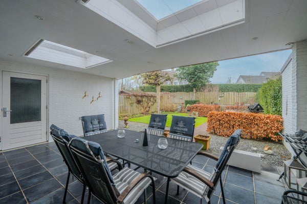 De mooi aangelegde achtertuin is volledig omheind. Het terras, dat vanaf de woonkamer, keuken én garage te betreden is, is voorzien van een ruime overkapping met twee lichtkoepels.