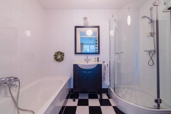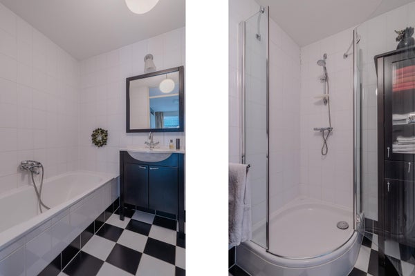 Daarnaast is er een badkamer voorzien van douche, ligbad en wastafel, en een separaat toilet aanwezig.