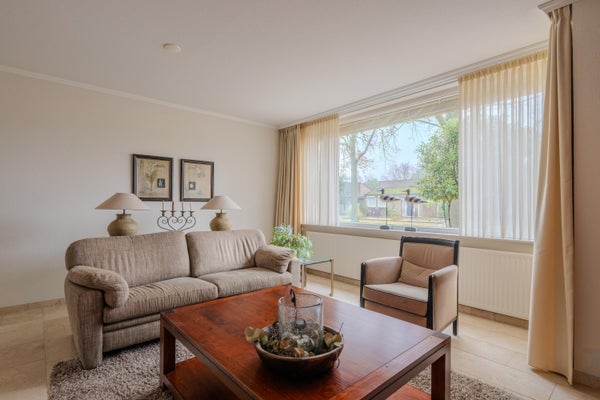 In de woonkamer, de eetkamer en de open keuken ligt dezelfde vloer als in de ontvangsthal. Door de grote raampartij aan de voorzijde van de kamer heeft u veel natuurlijke lichtinval. De raampartij bestaat uit een hardhouten kozijn met HR+glas en een rolluik.