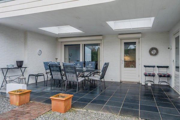 De eetkamer is voorzien van een schuifpui met elektrisch bedienbaar rolluik, die toegang biedt tot het ruime terras met een overkapping en twee lichtkoepels.