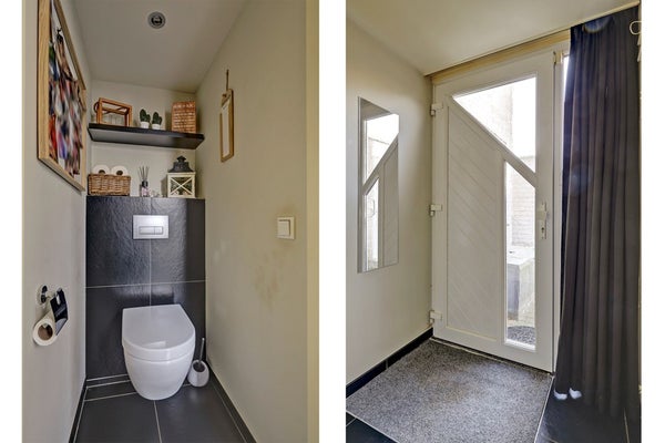 U betreedt de woning via de hal met in de hal de toegang naar de cv-ruimte (Intergas 2016) en de toiletruimte met hangend toilet. Vanuit deze hal linksaf naar de bijkeuken en berging/garage met elektrische sectionaaldeur. Vanuit de hal aan de rechterzijde de toegang naar de ruime woonkamer met bij binnenkomst direct aan de rechterzijde de inbouwkeuken met alle benodigde apparatuur. De hal, woonkamer en keuken zijn voorzien van vloerverwarming. Via de schuifpui in de achtergevel naar het overdekte terras en de diepe tuin met geheel achterin een berging.