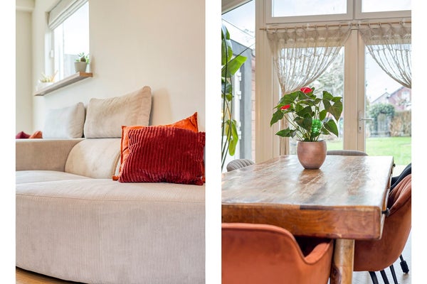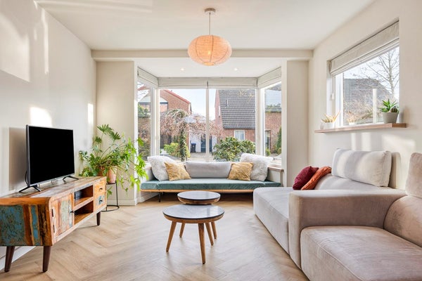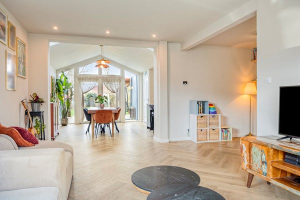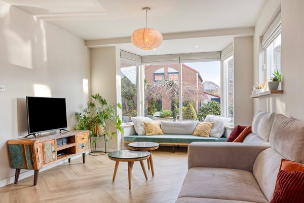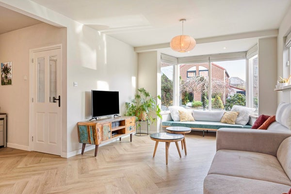 De lichte en ruim uitgebouwde woonkamer is een echte eyecatcher en beschikt over een erker en openslaande tuindeuren naar het terras, wat zorgt voor veel daglicht en een fijne verbinding met de tuin.