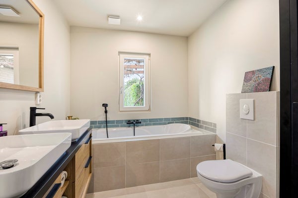• De badkamer op de begane grond is modern afgewerkt met ligbad, inloopdouche, toilet en dubbele vaste wastafel. Het geheel is voorzien van vloerverwarming.