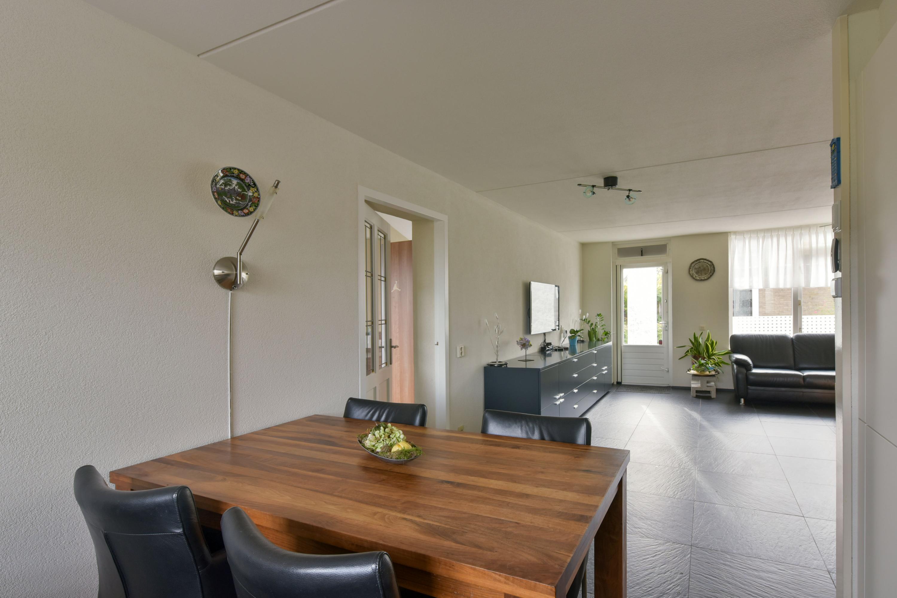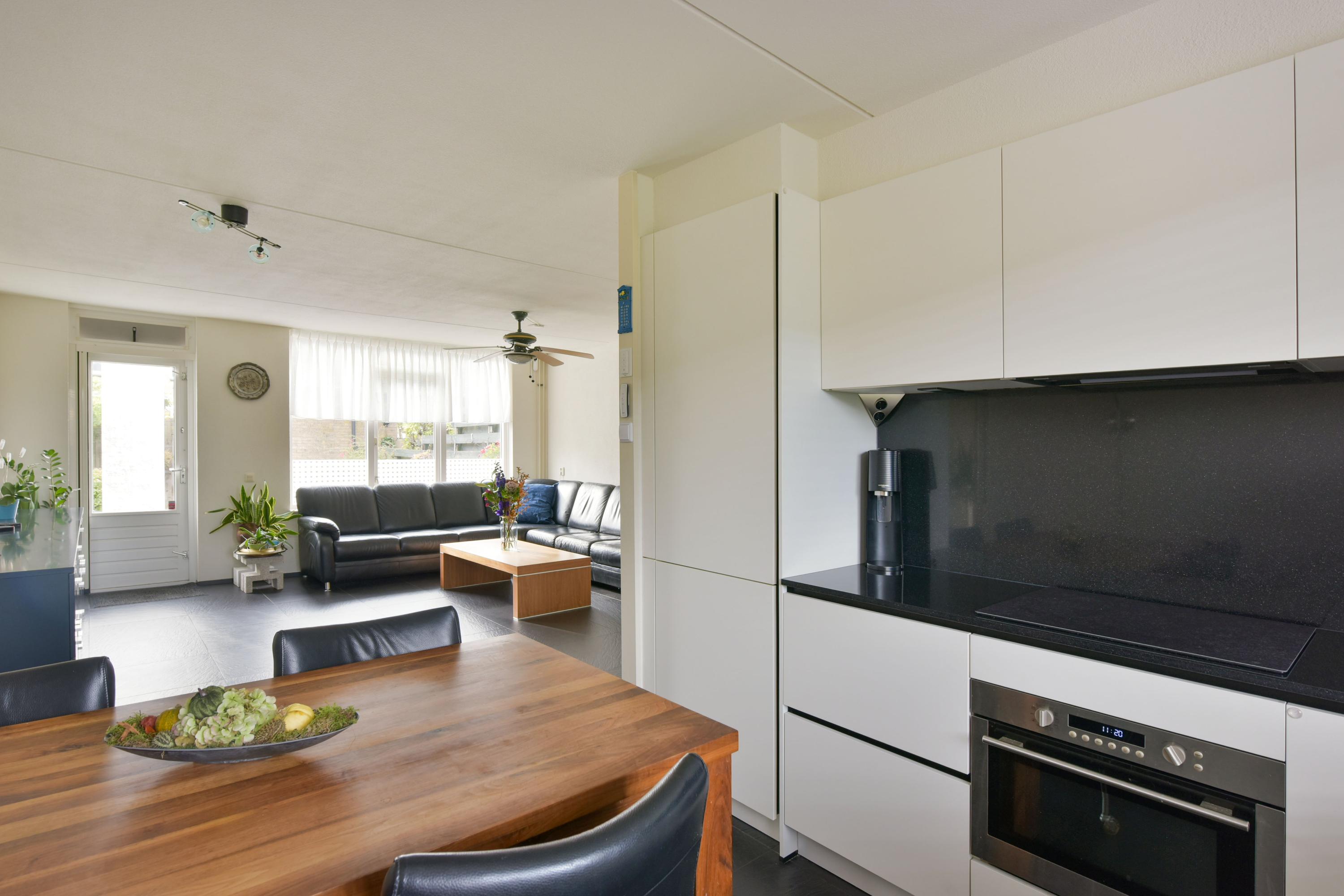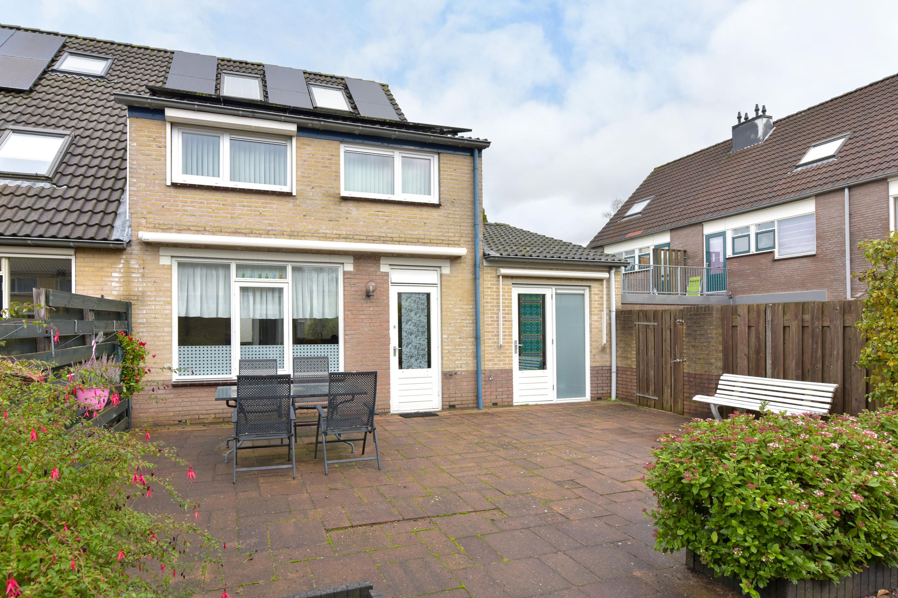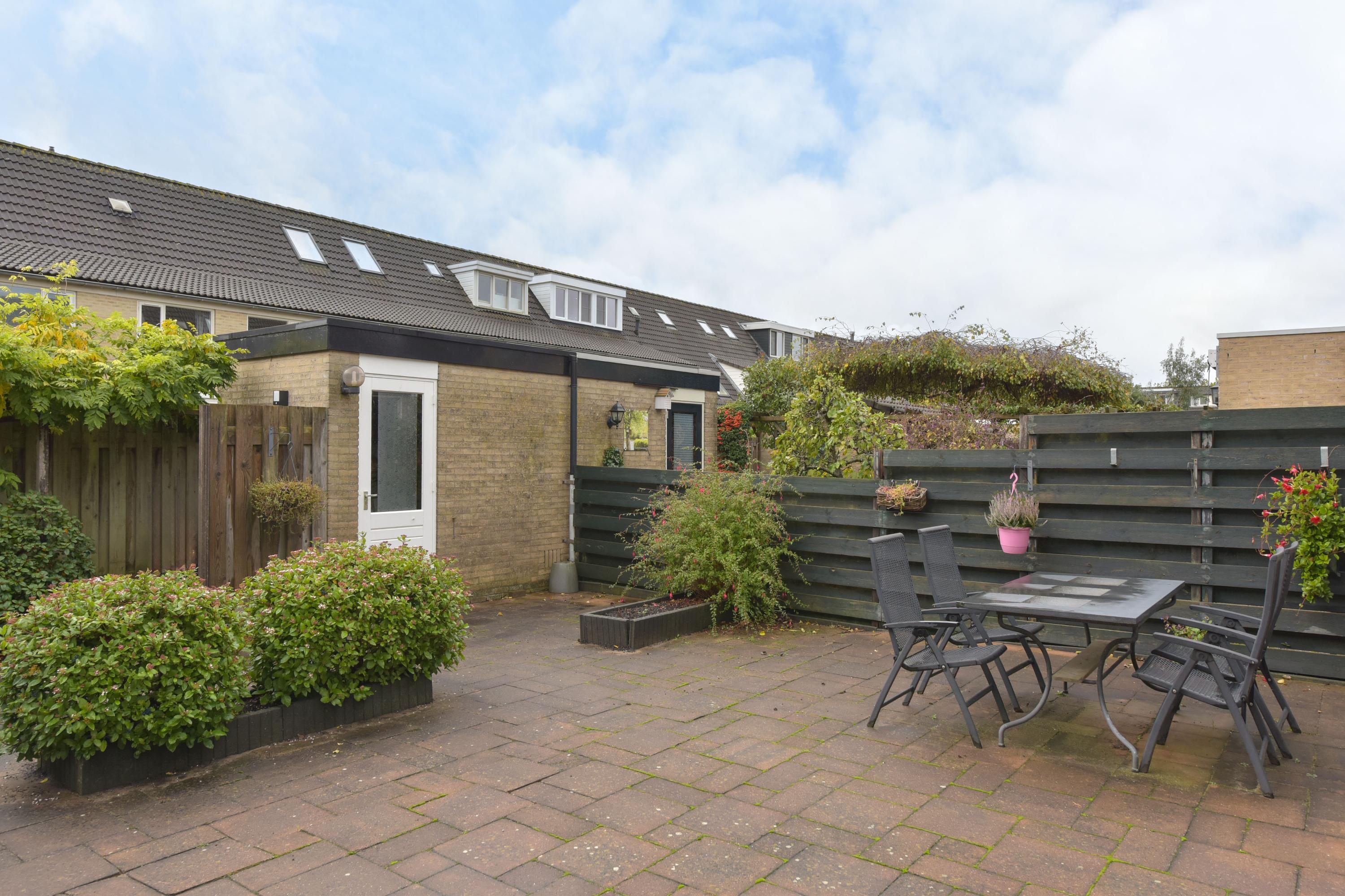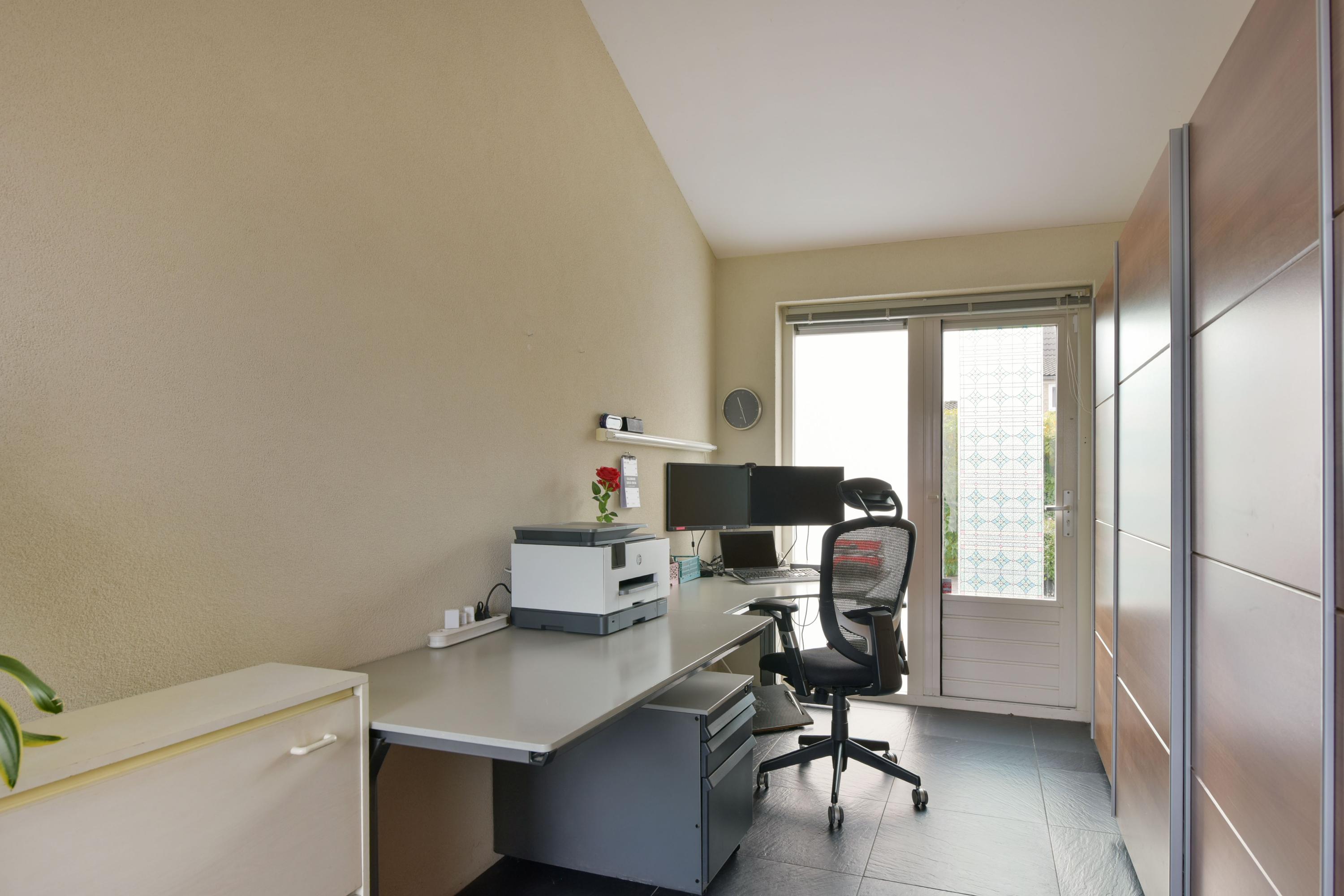 De begane grond heeft een lichte woonkamer met grote ramen en een L-vormige keuken met moderne inbouwapparatuur. Via de zithoek zijn er deuren naar de zonnige achtertuin, waar ook het kantoor toegankelijk is. De eerste verdieping bevat drie ruime slaapkamers en een complete badkamer. De tweede verdieping heeft een vierde slaapkamer en een voorzolder met wasmachine-aansluitingen. De zuidelijk gelegen achtertuin is onderhoudsvriendelijk en voorzien van een stenen berging.