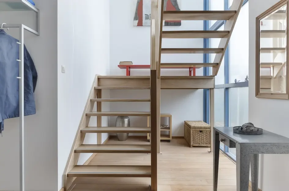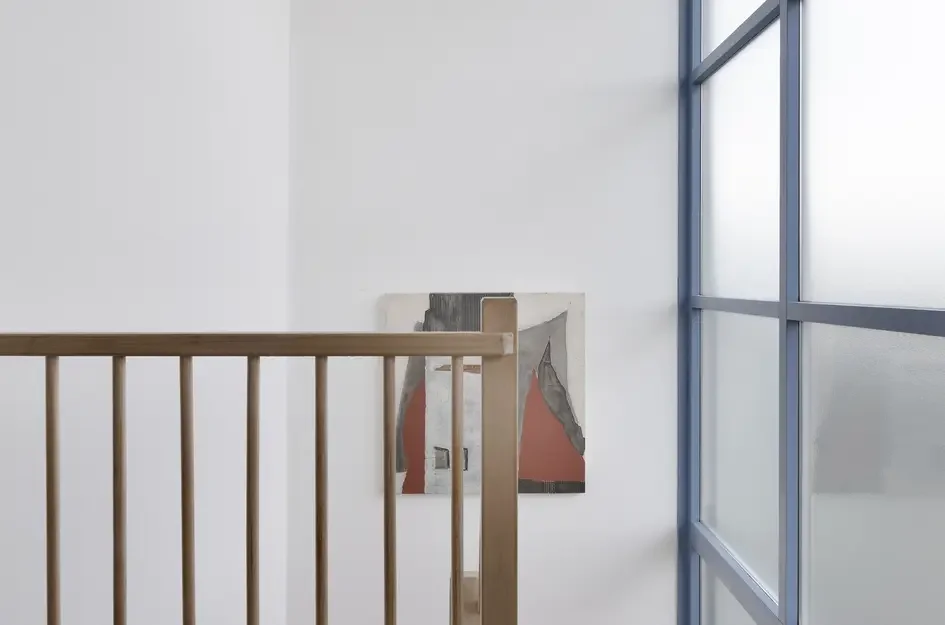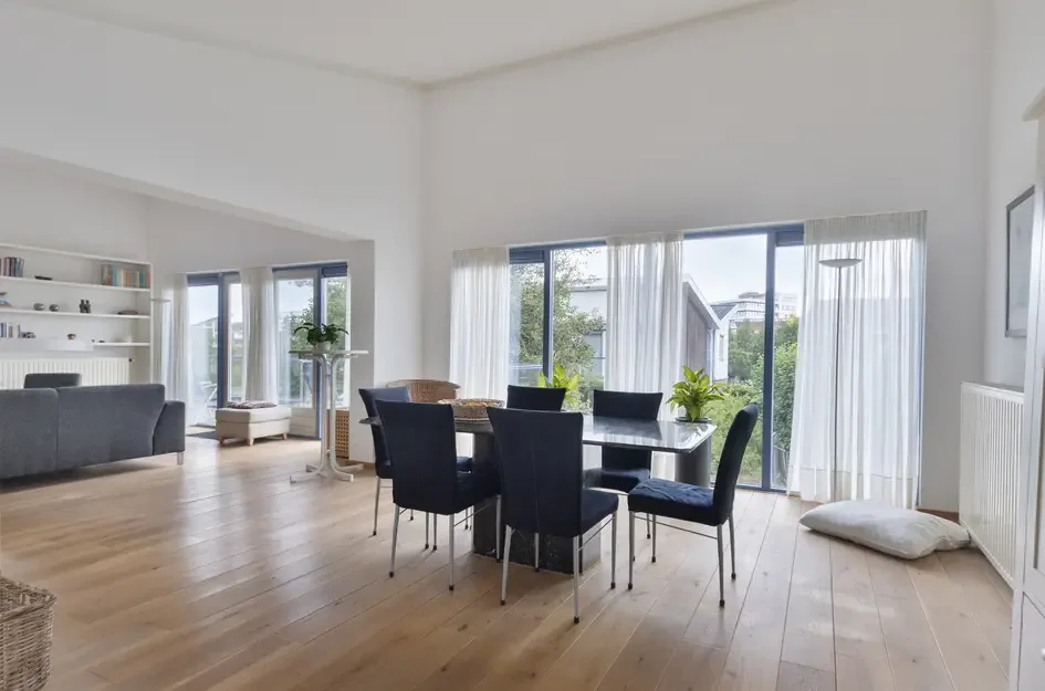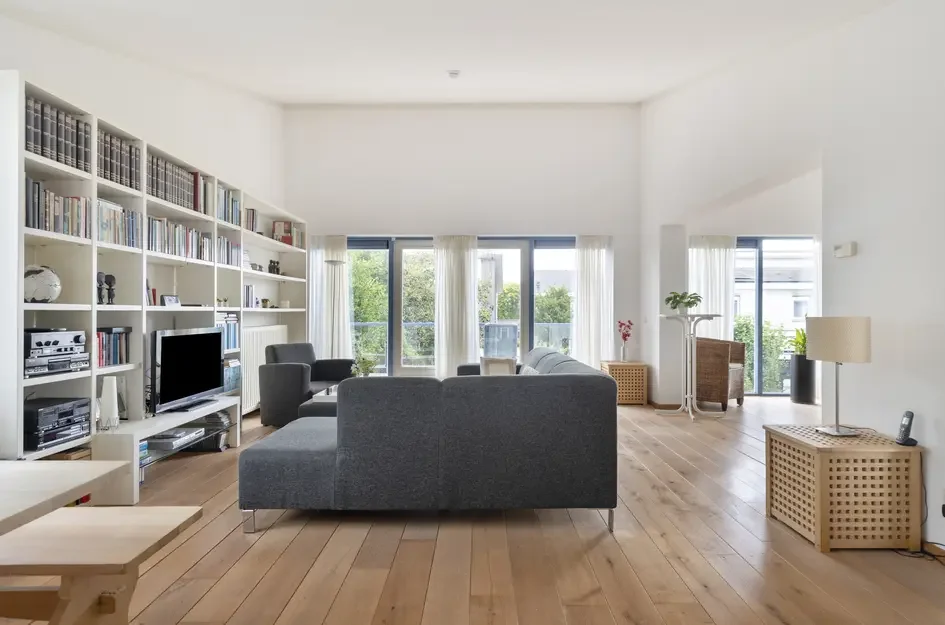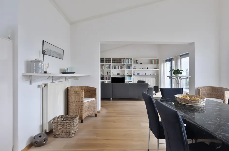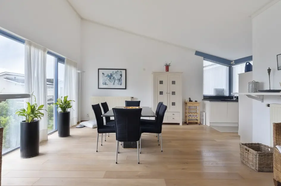 De eerste verdieping heeft een ruime woonkamer met hoge plafonds en openslaande deuren naar een groot dakterras van 25 m², dat zon biedt van de ochtend tot de avond. Hier zijn ook een derde slaapkamer/werkkamer en een open keuken met moderne voorzieningen.