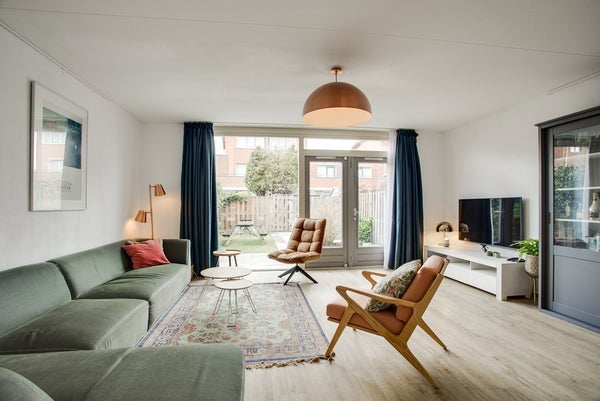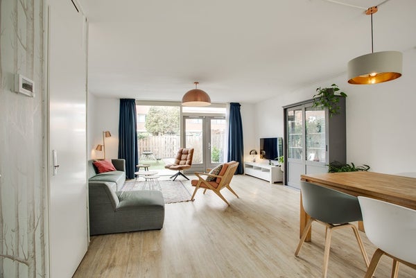 Vanuit de living veel lichtinval en zicht door de glas pui met openslaande deuren naar de zonnige achtertuin op het westen.
