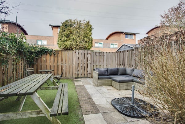 Aan een kindvriendelijk en autovrij hofje gelegen moderne tussenwoning MET GARAGE en een zonnige achtertuin met achterom ligt dit zeer ruime familiehuis met een royale living en 5 slaapkamers.
