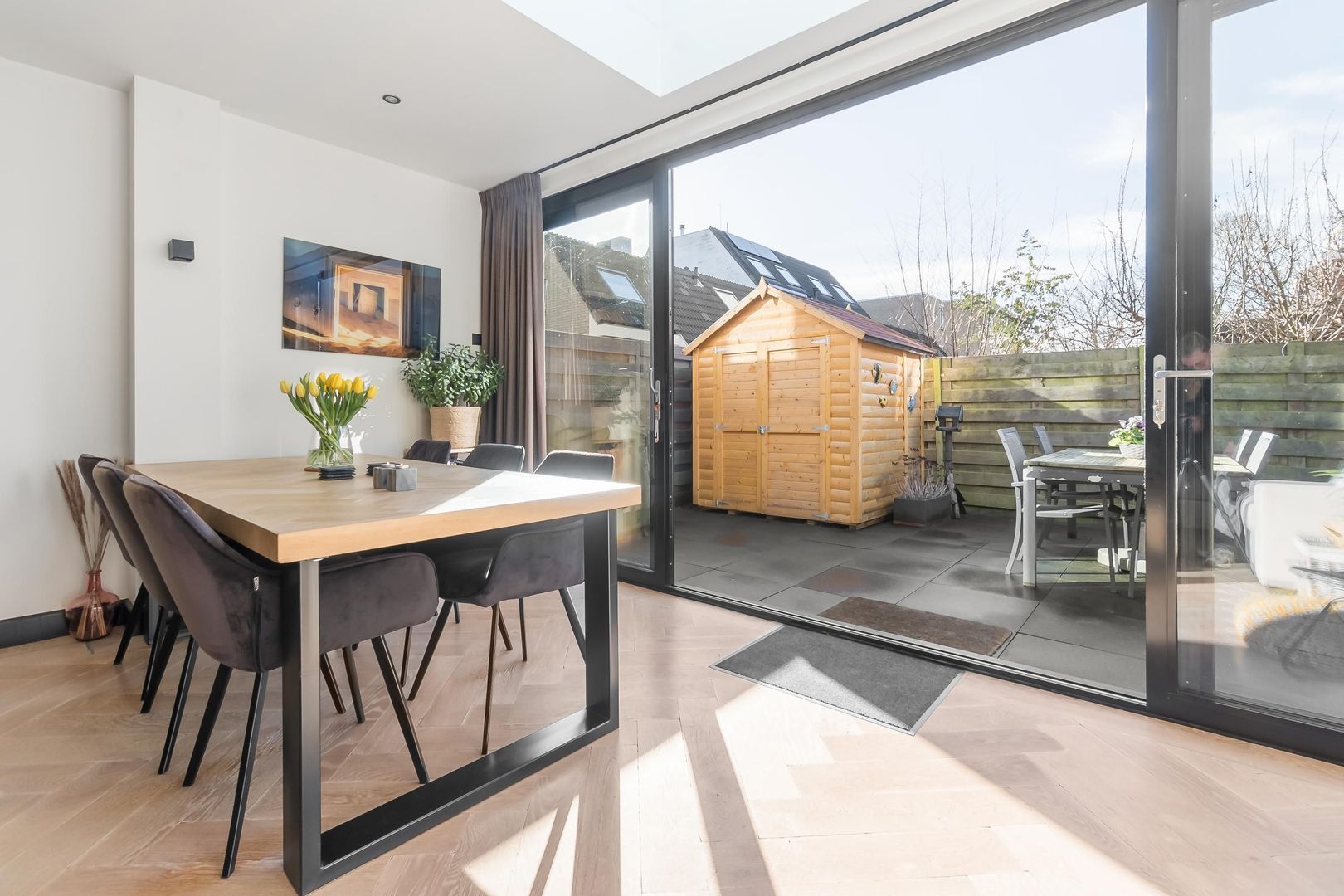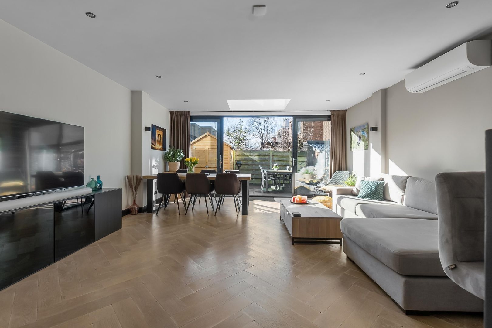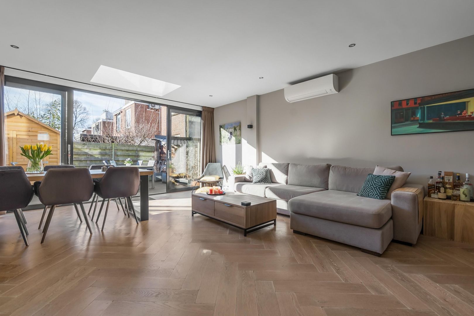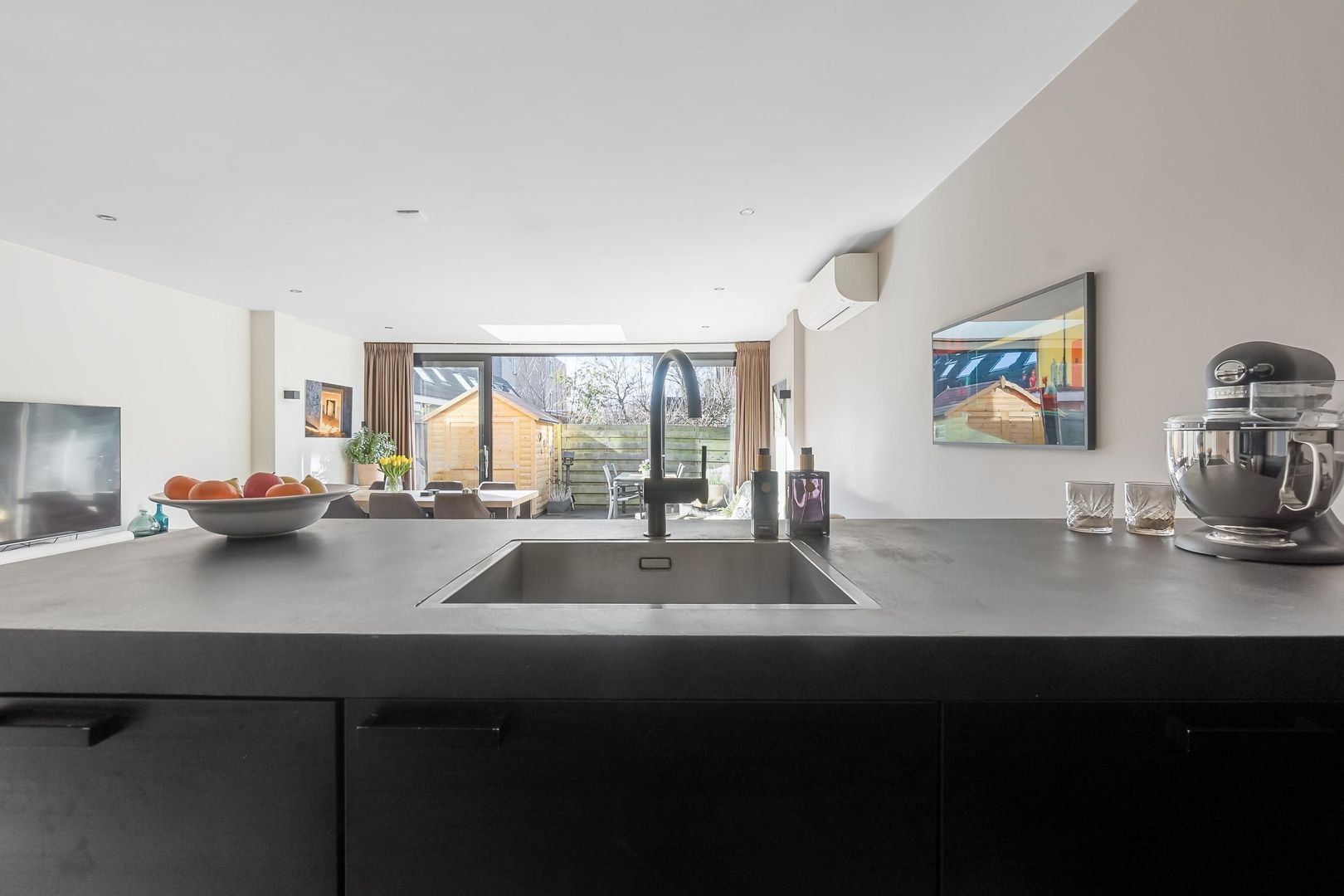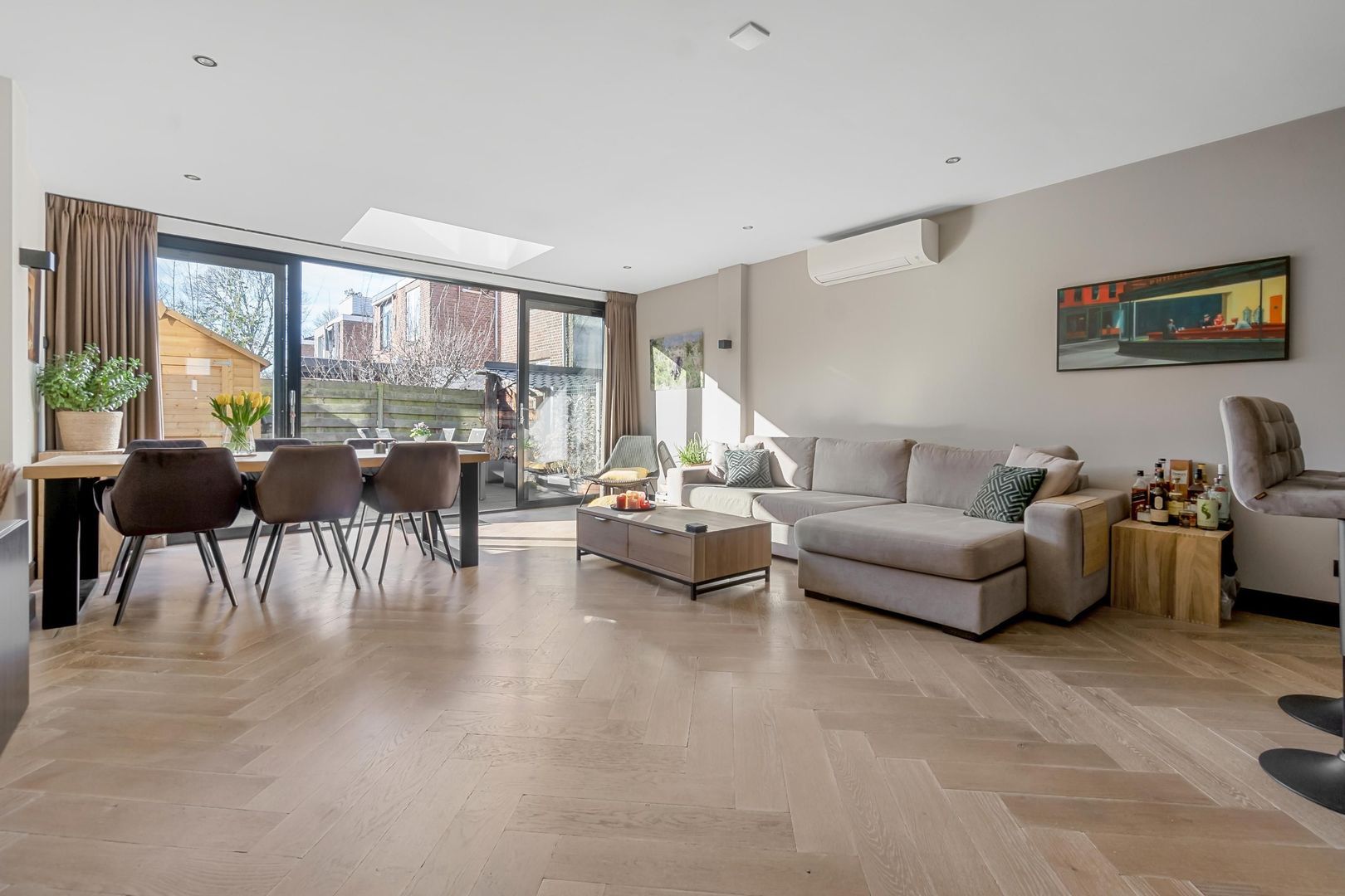 Bij binnenkomst kom je in de hal met een praktische trapkast en een modern toilet. De sfeervolle woonkamer heeft een houten vloer en een schuifpui naar de achtertuin. De open keuken is uitgerust met een spoeleiland en Miele inbouwapparatuur. De slaapkamer bevindt zich aan de voorzijde en de badkamer beschikt over een inloopdouche, wastafel en designradiator.
