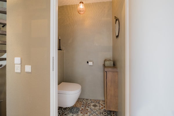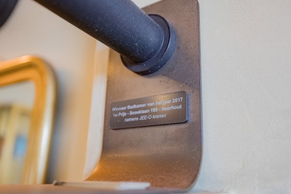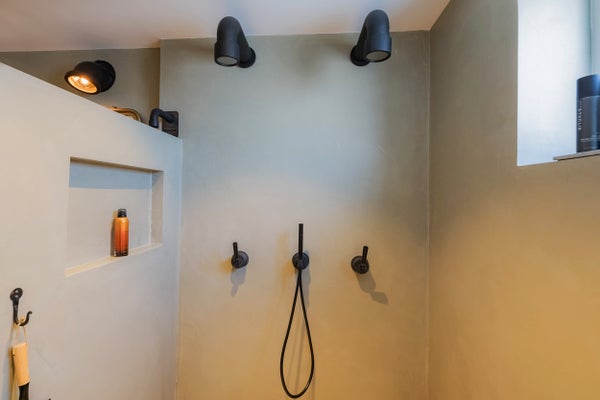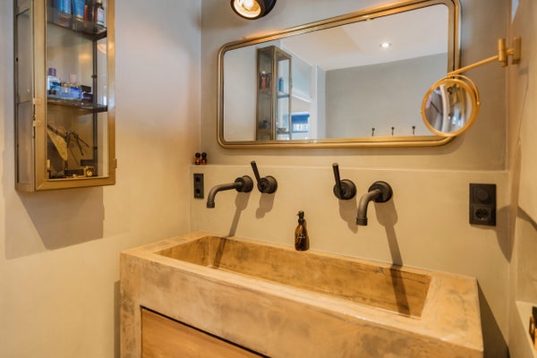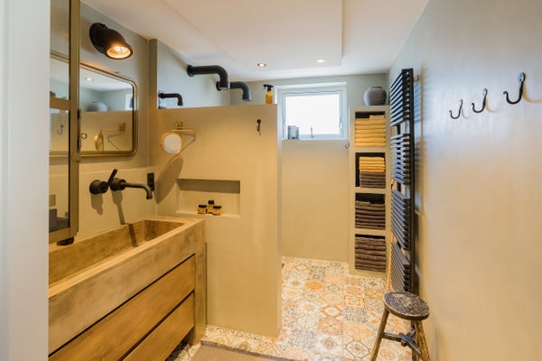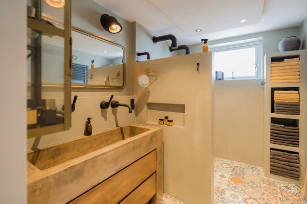 En dan de badkamer... deze is echt next-level. Stoer, modern en bekroond met designprijzen. We noemen o.a. JEE-O kranen en dubbele douchekoppen in de inloopdouche, een royale betonstuc wastafel met dubbele houten lades.