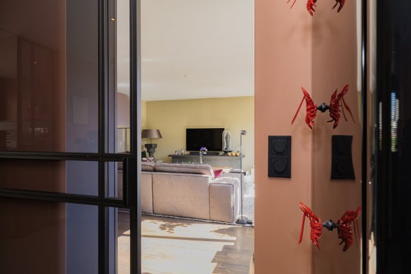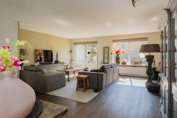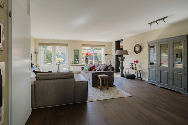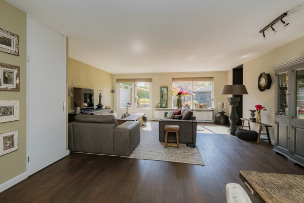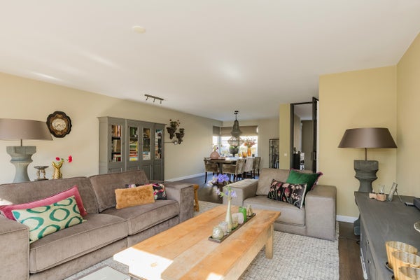 Zodra je binnenstapt via de uitgebouwde entree, word je verwelkomt door de warme sfeer van dit huis. De hal is voorzien van een garderobe en een luxe modern toilet. Via de stalen deur met glas loop je de zeer royale woonkamer van maar liefst 50 m² binnen. Verder de openslaande deuren naar de zonnige tuin, gelegen op het zuidwesten.