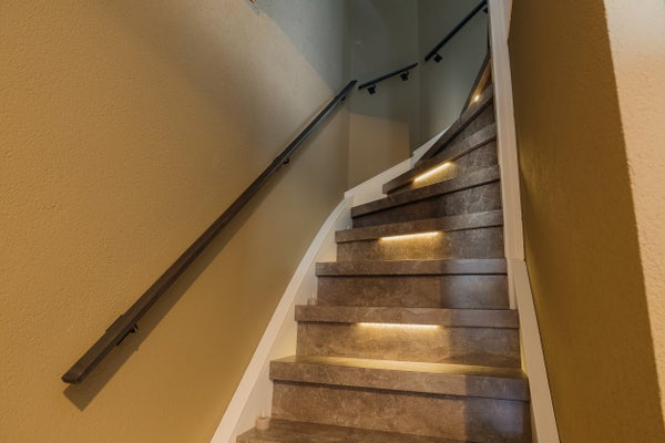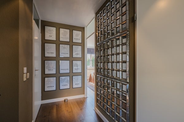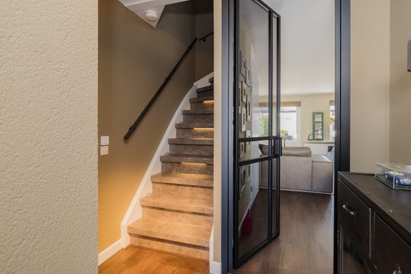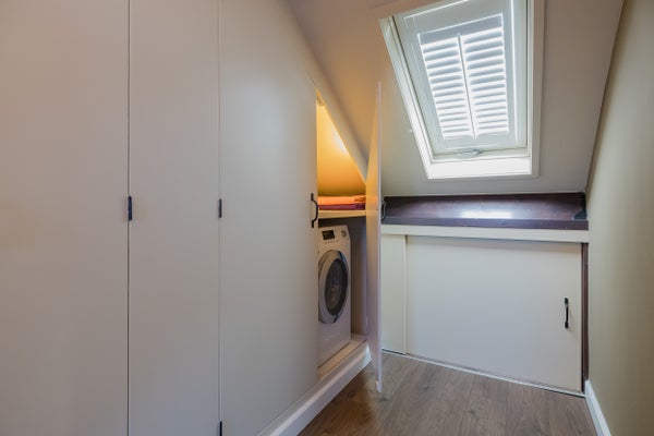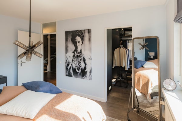 Via de vaste, eveneens gerenoveerde, trap bereik je de volledig modern afgewerkte tweede etage. Op de overloop is een strakke inbouwkastenwand geplaatst waarin de cv-ketel, wasmachine, droger en de omvormer voor de zonnepanelen zijn weggewerkt.