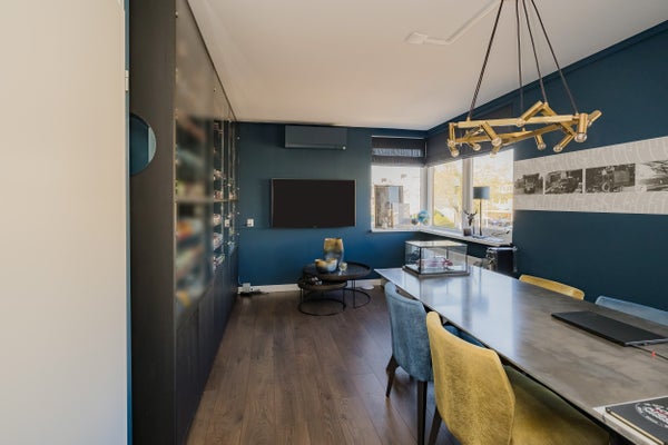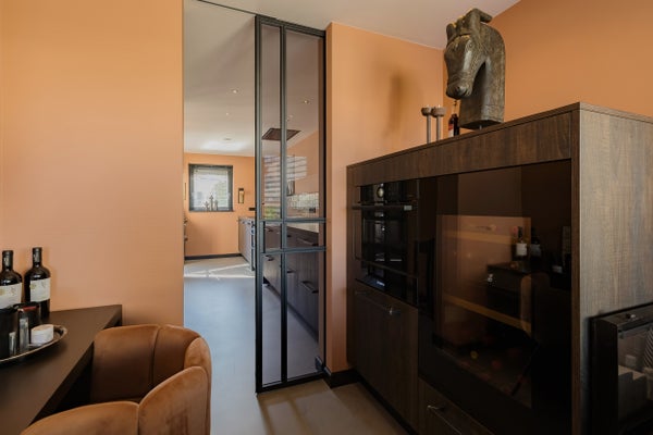 De zwarte stalen deuren met glas geven een modern karakter aan de begane grond en leiden je o.a. naar de royale keuken (2022). Hier vind je alles wat je nodig hebt, een strakke opstelling met donker houten fronten, een werkblad van 5 meter lang, inductiefornuis met maar liefst 3 ovens (merk STEEL) , een afzuigkap fraai in het plafond weggewerkt, een Quooker en een vrijstaande koel-vriescombinatie.