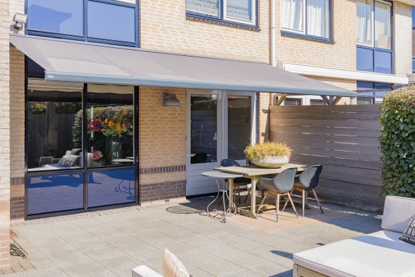 Dankzij de achterom is de tuin ook praktisch in gebruik en met een elektrisch bedienbare knikarm zonnescherm.