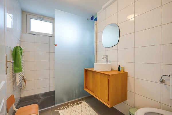 The staircase leads to the attic floor, which features a spacious bedroom with a walk-in closet and the second bathroom. This bathroom also includes a convenient laundry area. It is equipped with a toilet, shower and washbasin with vanity unit.