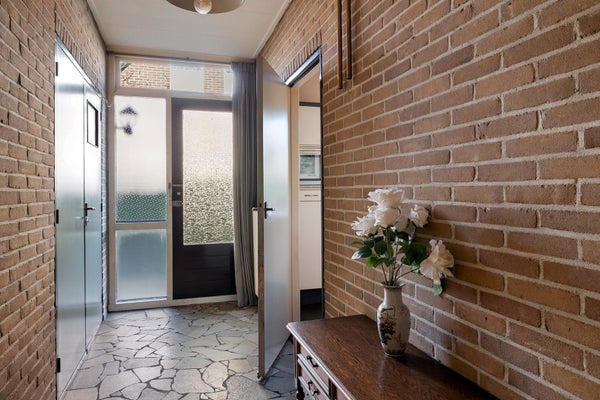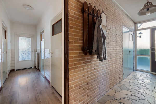 Entree/hal met vaste kastruimte en toilet voorzien van fontein, keuken voorzien van inbouwapparatuur, woonkamer, badkamer voorzien was wastafel en douche, drie slaapkamers (7m², 10m² en 11m²), bijkeuken met achterentree en witgoedaansluitingen.