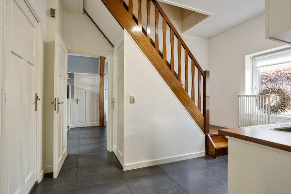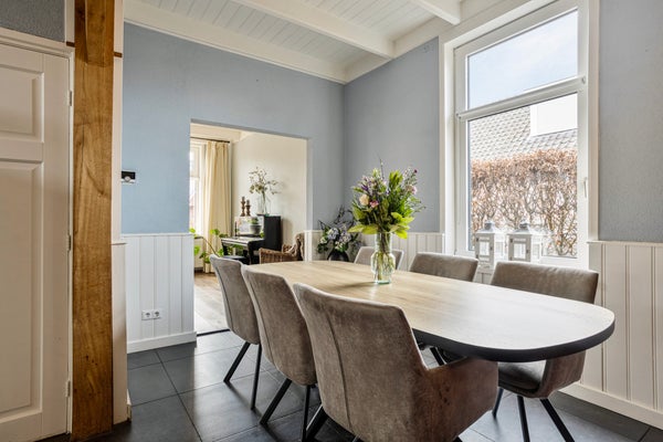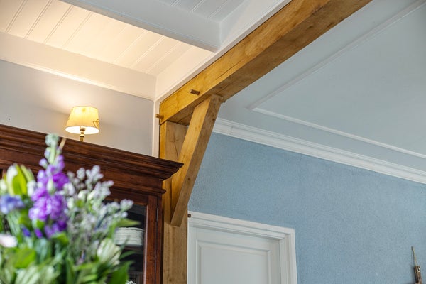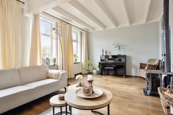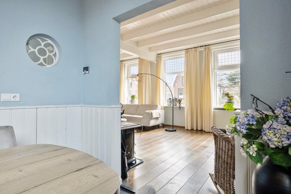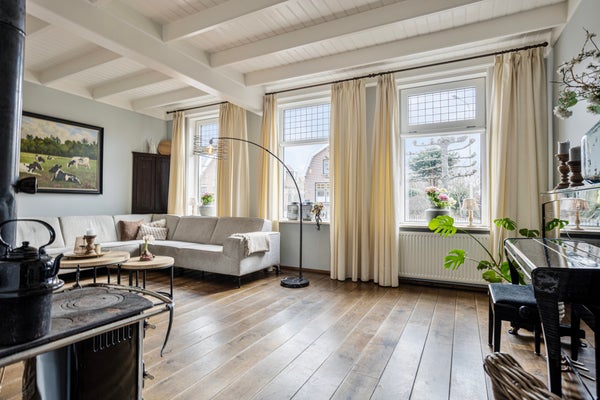 Kom binnen via de voordeur in het halletje met toegang tot de woonkamer en woonkeuken. Al zul je merken dat de voordeur hier vooral voor bezoek is. Want eerlijk is eerlijk: in Vriezenveen gebruiken we die zelden. Hier kom je gewoon achterom. Dat zegt alles over de informele, gemoedelijke sfeer van wonen aan de Hammerweg. Aan de voorzijde vind je de sfeervolle woonkamer met een plafondhoogte van 2.95 m. Een fijne plek waar je ’s winters heerlijk warm bij de knisperende houtkachel zit, en waar op de zomerdag het licht door de gemoderniseerde glas-in-loodramen naar binnen valt. De houten vloer en authentieke details zorgen voor warmte en karakter.