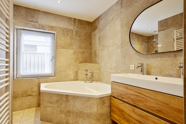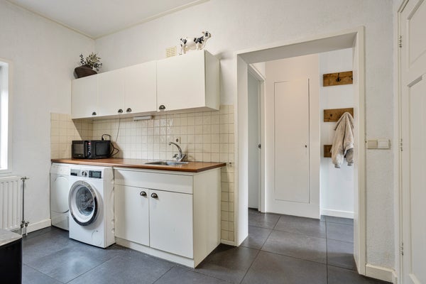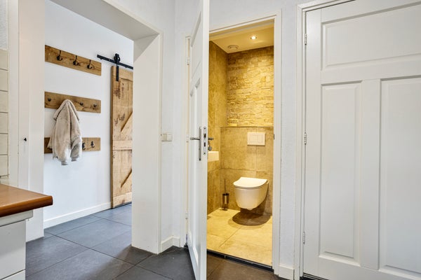 Aansluitend vind je de ruime bijkeuken met een handig aanrechtblok met aansluitingen voor wasmachine en droger. Vanuit hier bereik je het moderne toilet en de badkamer (2024), uitgevoerd in natuurlijke tinten met inloopdouche, dubbele wastafel met verwarmde en verlichte spiegel, hoekligbad, vloerverwarming en zowel natuurlijke als mechanische ventilatie. Instapklaar en comfortabel.