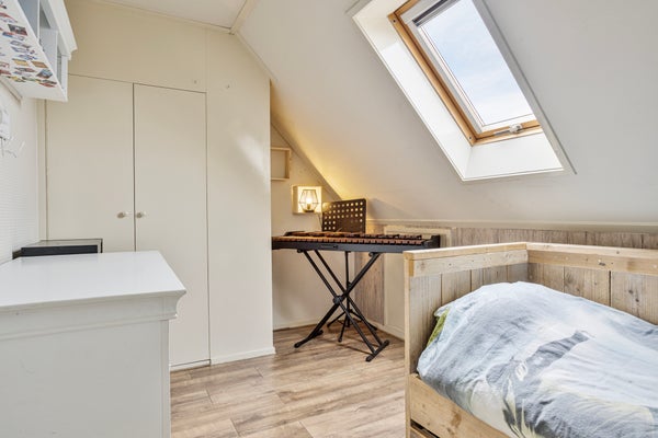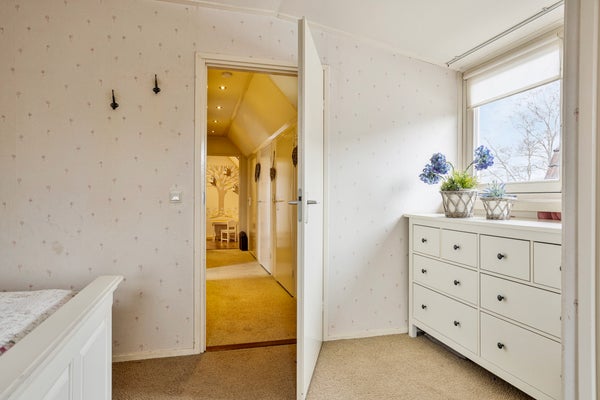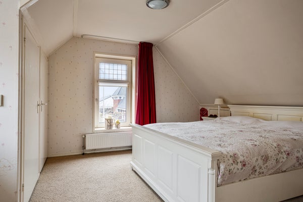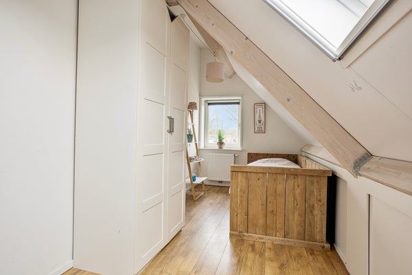 Via de houten trap in de bijkeuken loop je naar boven. Op de eerste verdieping vind je aan de voorzijde 2 slaapkamers. De masterbedroom (14 m²) beschikt over een dakkapel en vaste kast, en heeft uitzicht op de dorpsstraat en de volgroeide leilindes in de voortuin. De tweede slaapkamer (10 m²) heeft een dakraam en eveneens een vaste kast. In de uitbouw aan de achterkant zijn nog eens 2 ruime gespiegelde slaapkamers gecreëerd. Deze hebben allebei een hoog plafond met dakraam en een raam met uitzicht over de achtertuin en de landerijen van de Westerhoeven. Hier word je wakker met weids uitzicht. Ideaal voor bijvoorbeeld opgroeiende kinderen, logees of als extra werk- of hobbyruimte. Op de overloop bevindt zich een tweede toilet en een handige wastafel in de tussenhal.