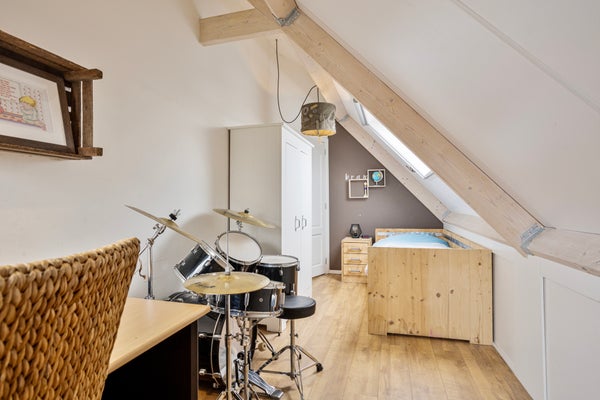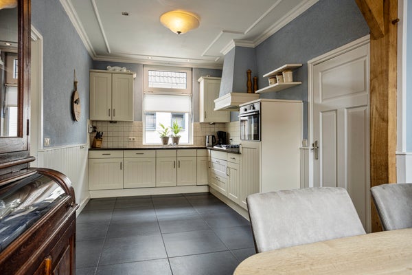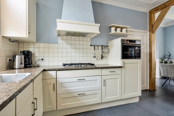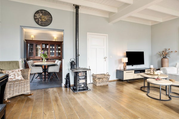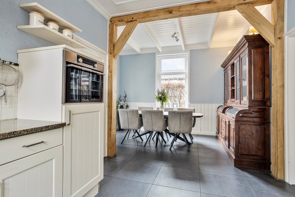 De woonkeuken is ruim opgezet en voelt direct als een plek waar geleefd mag worden. Grote vloertegels, de houten draagbalk en het hoge plafond van 2.75 meter met sfeervolle plafondplanken geven een landelijke uitstraling. De keuken zelf is praktisch en in stijl, voorzien van onder andere vaatwasser, oven, koelkast, gaskookplaat, afzuiging en een hardstenen werkblad. Hier kook je uitgebreid voor vrienden en familie, of maak je ’s ochtends rustig het ontbijt terwijl de kinderen aan tafel schuiven.