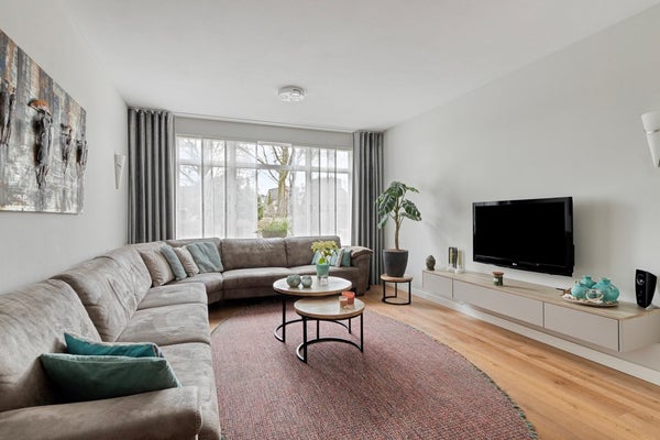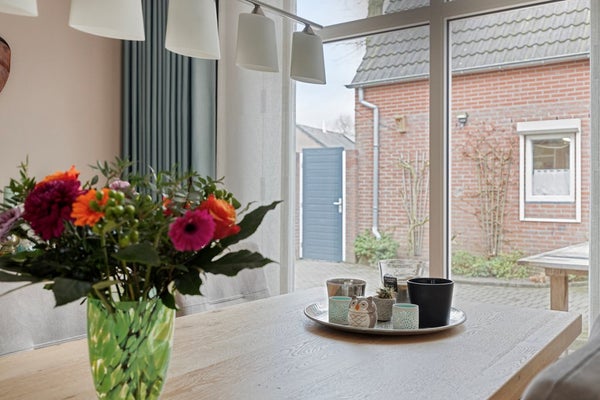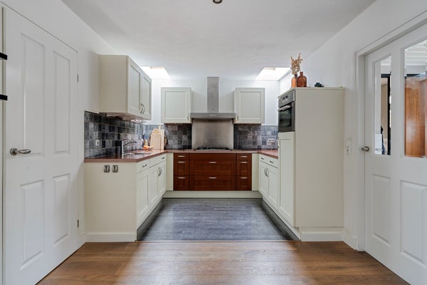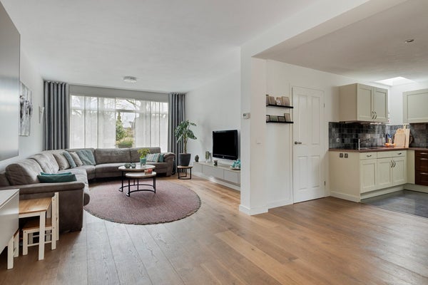 De zeer royale uitgebouwde woonkamer is een heerlijke leefruimte. Aan de voorzijde bevindt zich een comfortabele zithoek met vrij uitzicht op het groen, terwijl aan de achterzijde de eethoek is gesitueerd met een grote raampartijen tot aan de vloer met uitzicht op tuin en terras. Centraal in de woning ligt de U-vormige keuken, onder een opbouw met daglichttoetreding – een echte eyecatcher die zorgt voor extra licht en ruimtegevoel. De keuken is voorzien van alle apparatuur en biedt veel werkruimte. Aansluitend een praktische bijkeuken met inbouwkast en een loopdeur naar de tuin.