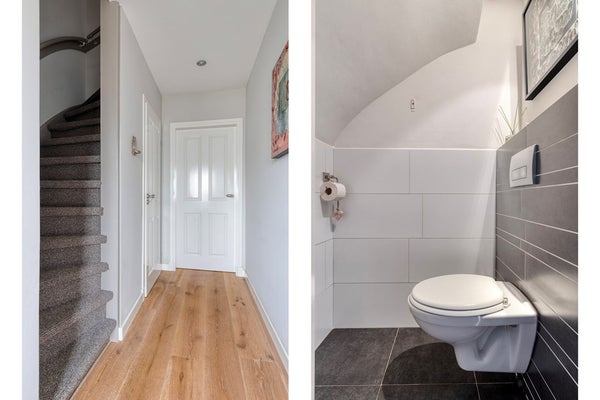 Via de voordeur toegang tot de verzorgde entree, waar direct de moderne afwerking opvalt: een fraaie eikenhouten whitewash vloer, strakke stucwerkwanden en -plafond met inbouwverlichting. Het moderne, separate toilet is uitgevoerd met eigentijdse betegeling en een vrijhangend closet.