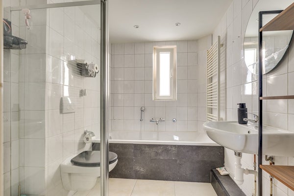 De volledig betegelde badkamer beschikt over: