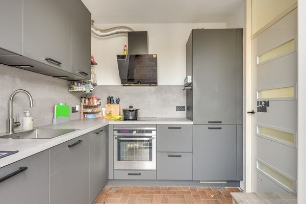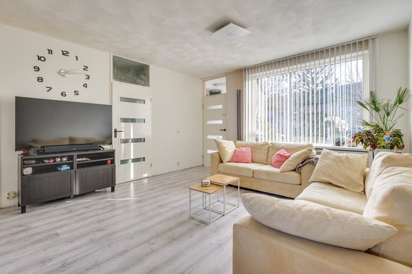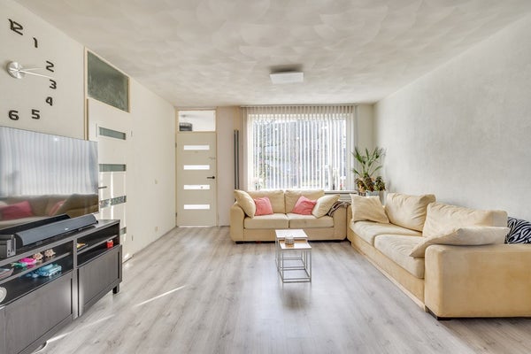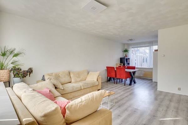 De tuingerichte woonkamer is heerlijk licht en biedt direct contact met de achtertuin. De ruimte is afgewerkt met een laminaatvloer en gestucte wanden. Vanuit de woonkamer bereik je de trapopgang naar de verdieping en de afzonderlijke keuken aan de achterzijde.