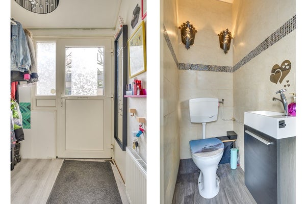 Via de voortuin bereik je de entree met hal, garderobe en volledig betegelde toiletruimte met fonteintje.