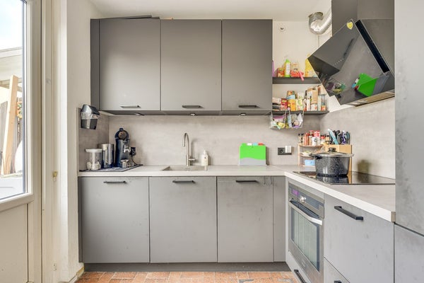 De keuken is opgesteld in een praktische hoekopstelling en voorzien van onder andere: