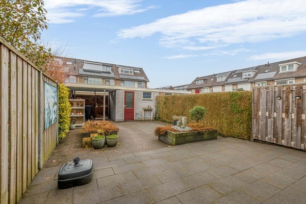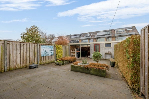De verzorgde achtertuin ligt op het westen. Een groot deel is voorzien van antraciet kleurige tegels. In het midden zijn er enkele verhoogde borders met beplanting en een waterornament. Achterin de tuin staat de stenen berging met daarnaast een overkapping. In de tuin en in de schuur is elektra aanwezig. Aan de achtergevel van het huis is recent een nieuw zonnescherm geplaatst.