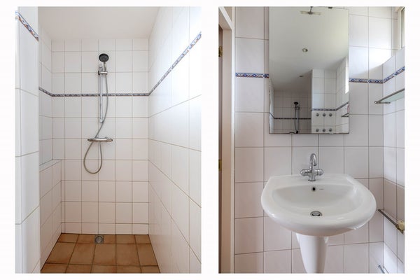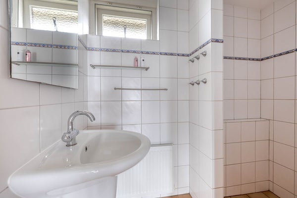 De badkamer is geheel betegeld en beschikt over een doucheruimte, een wastafel, radiator en inbouwspots in het gestuukte plafond.