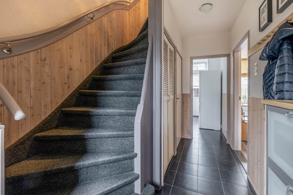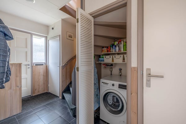 Je komt deze woning binnen in een gang met links de meterkast, dan de trapopgang naar de eerste verdieping, de trapkast met wasmachineaansluiting en het toilet. Het toilet is geheel betegeld en voorzien van vrij hangend closet. Vanuit de gang kun je doorlopen naar de woonkamer of naar de keuken.