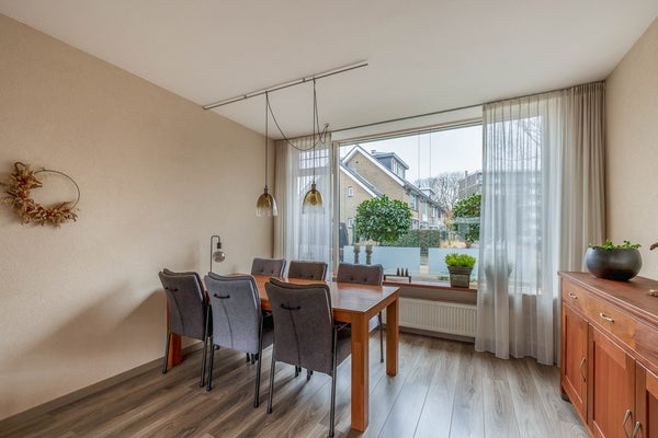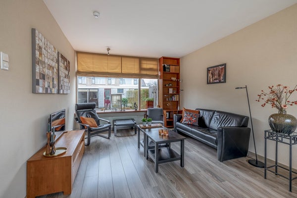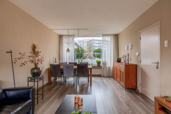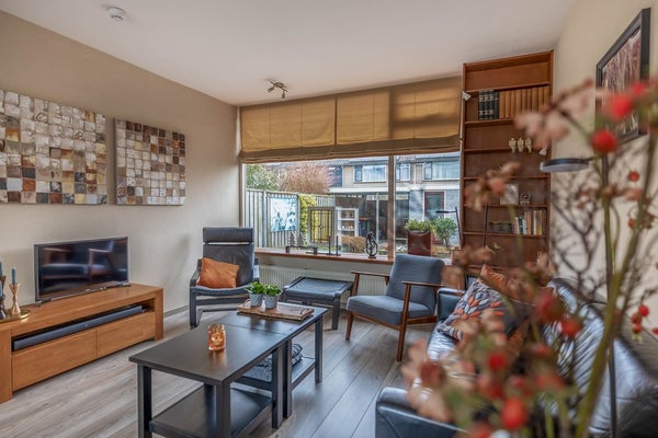 De woonkamer beschikt over grote ramen, waardoor er veel lichtinval in de woning is. In het verleden is er een open keuken geweest, maar op enig moment is de muur teruggeplaatst en is de keuken apart gemaakt.