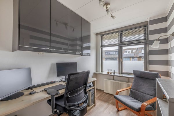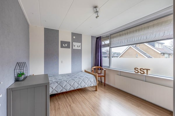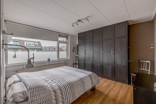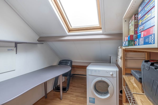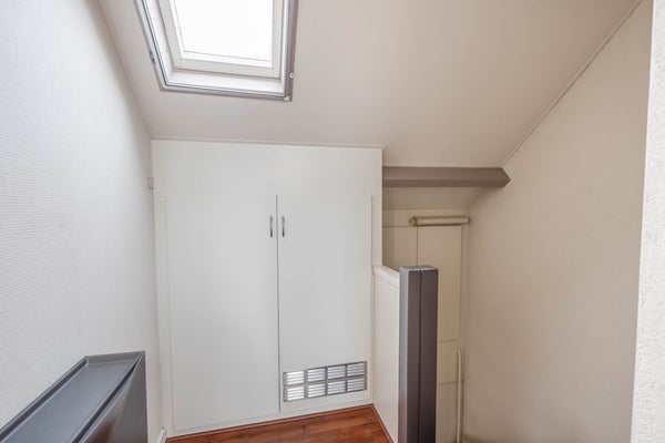 Bovenaan de trap kom je op de overloop. Hier is lichtinval en ventilatiemogelijkheid door de aanwezigheid van een Velux dakraam. Achter knieschotten is opbergruimte en ook de cv-combiketel heeft hier zijn plek. Vanaf de overloop is er toegang tot twee kamers. De kleine kamer heeft eveneens een Velux dakraam en kan prima gebruikt worden als hobby/werkruimte. De royale slaapkamer is voorzien van een dakkapel aan de achterzijde en een dakraam aan de voorzijde.