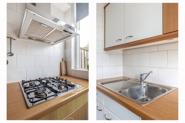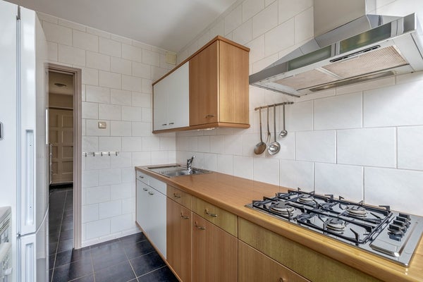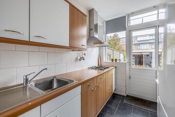 De keuken heeft aan twee zijden een rechte opstelling met veel opbergruimte en heeft in de vloer een elektrische vloerverwarming. Er is een vierpits gaskookplaat met afzuigschouw en combi-magnetron. De koel-/vrieskast wordt ter overname aangeboden. Vanuit de keuken geeft een deur toegang tot de tuin.