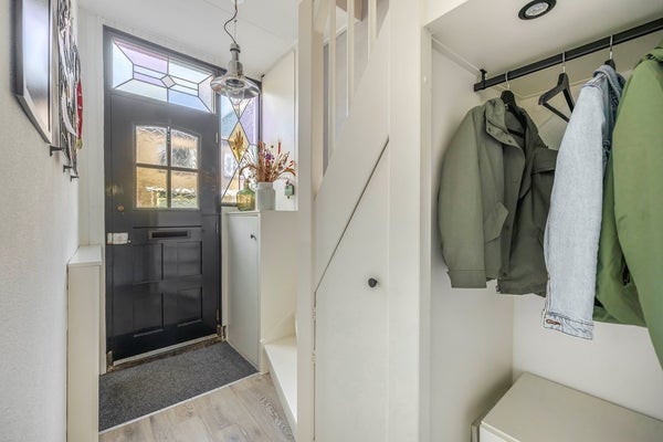 Binnenkomst in de hal met garderobe, meterkast (7 groepen, moderne installatie met dubbele aardlek) en de trap naar boven. De lichte doorzonwoonkamer (ca. 25,5 m²) voelt heerlijk ruim aan; de zithoek kijkt uit op de tuin en aan de voorzijde heb je alle plek voor een gezellige eettafel.