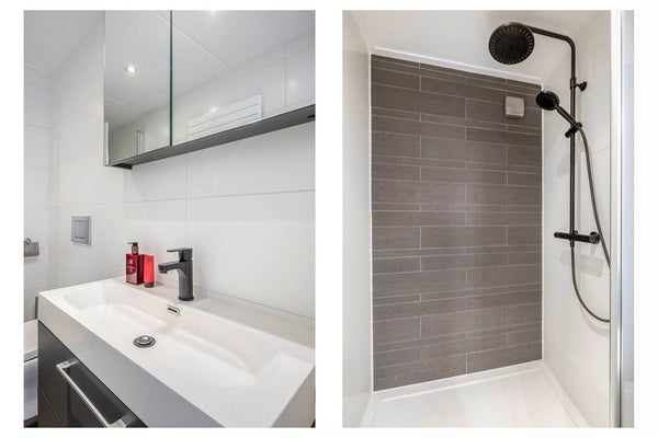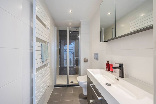 Via de overloop heb je toegang tot twee fijne slaapkamers en de trap naar de zolder. Tussen de kamers in is een grote kastenwand gebouwd, dus aan bergruimte heb je hier geen gebrek. De badkamer is "strak en modern" ingericht met een inloopdouche, een breed wastafelmeubel en een tweede toilet.