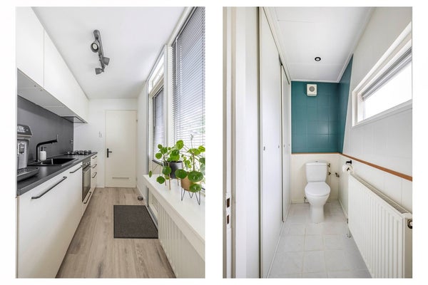 Aan de achterzijde vind je de uitgebouwde keuken en het toilet. Alles is strak afgewerkt met glad gestuukte wanden en een mooie laminaatvloer. In de uitbouw is slim gebruikgemaakt van de ruimte met vaste kasten voor extra bergruimte. Hier hangt ook de goed onderhouden Vaillant HR Solide cv-ketel (2011) en vind je de aansluitingen voor je wasmachine en droger.