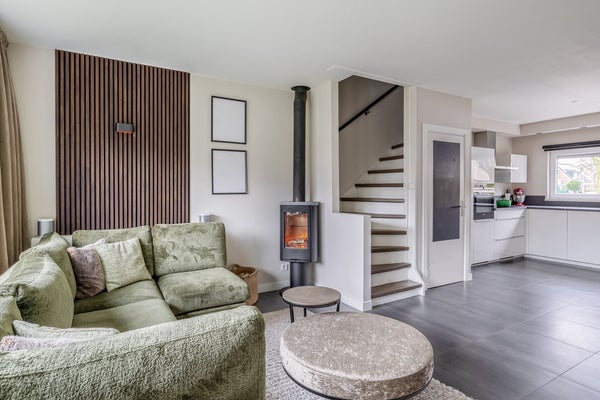 De begane grond vormt één rustig geheel, mede doordat storende radiatoren ontbreken dankzij de overal aanwezige vloerverwarming. De keuken loopt vloeiend over in het eetgedeelte, dat het hart van de woning vormt. Aan de achterzijde bevindt zich het zitgedeelte, waar een Contura speksteenkachel de centrale blikvanger is. Deze kachel is niet alleen een sfeervol element, maar zorgt door de natuurlijke eigenschappen van het speksteen ook voor een aangename en gelijkmatige warmteverspreiding in de gehele kamer.