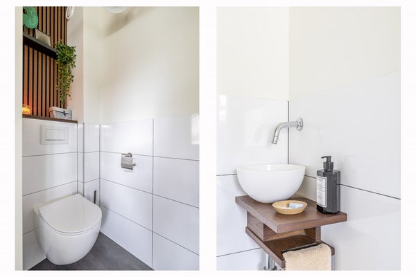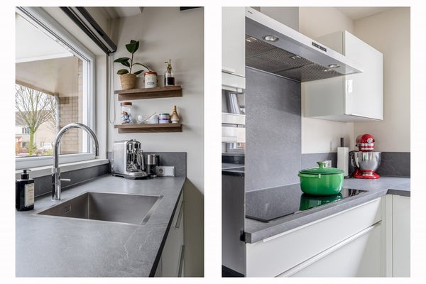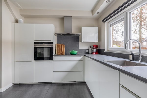 Bij binnenkomst in de ontvangsthal bevinden zich de meterkast en een nette toiletruimte met een vrijhangend toilet en fonteintje. Een houten schuifdeur vormt de overgang naar de keuken. Terwijl u in de keuken staat, kijkt u vrij uit over het aangrenzende speelveld. De keukenopstelling uit 2017 is praktisch in een hoek geplaatst. Alle moderne gemakken zijn aanwezig, van een inductiekookplaat en heteluchtoven tot een Quooker, terwijl in het plafond kleine inbouwspots in de koof voor de juiste verlichting zorgen.